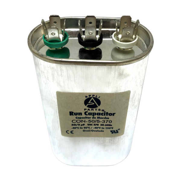 Appli Parts Dual Run Capacitor for ac 50+5 Mfd uF (microfarads) 370VAC CBB65 Oval Universal fit for hvac and other applications 2-3/4in Wide 1-3/4in Depth 4-5/8in High CON-50/5-370