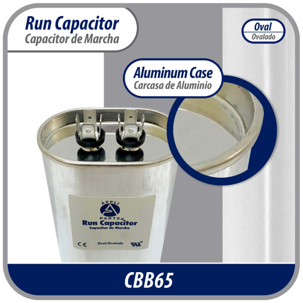 Appli Parts Condensador Capacitor de Marcha 12.5 Mfd uF (microfaradios) 370VAC CBB65 Universal Aire acondicionado y otras aplicaciones Ovalado UL E476928 5.1cm Ancho 2.5cm Profundidad 7.6cm Alto CON-12.5-370