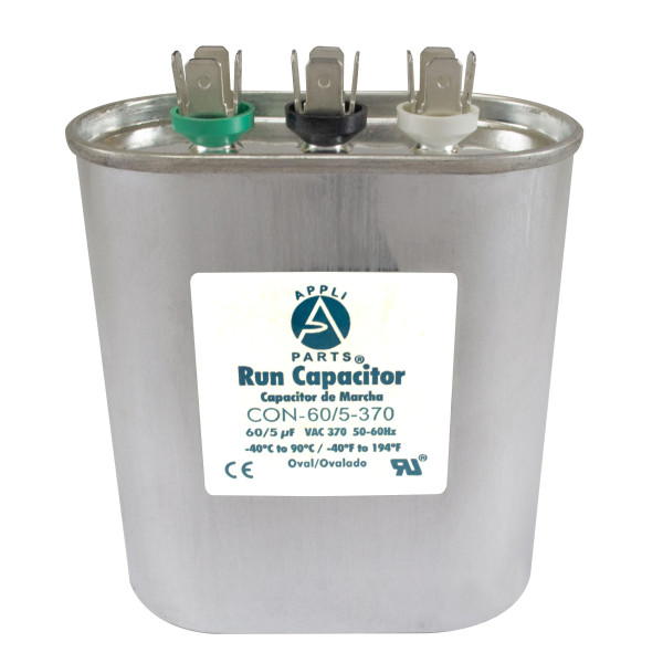 Appli Parts Condensador Capacitor de Marcha 60+5 Mfd uF (microfaradios) 370VAC CBB65 Universal Aire acondicionado y otras aplicaciones Ovalado UL E476928 7.6cm Ancho 4.5cm Prof 10.2cm Alto CON-60/5-370