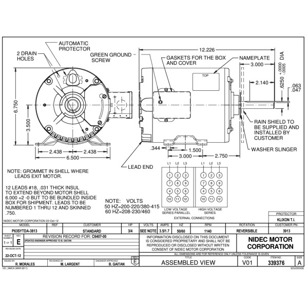 US Motors 3913 3/4 HP 1140 rpm, 208-230/460 V, 60Hz, 1 eje, TEAO, 1 velocidad, 6.3 diametro, Rotacion Reversible, Marco 56Y, P063TDA3813015B
