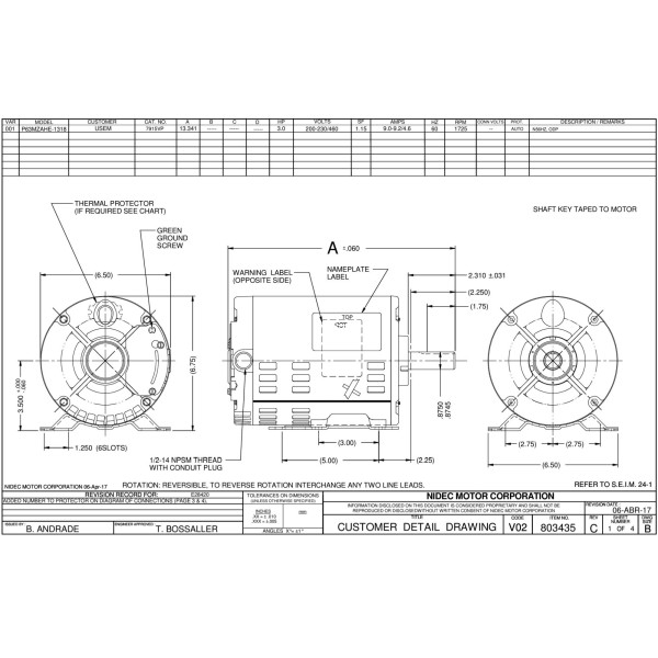 US Motors 3 hp 1725 rpm, 4 polos, 1 eje, 1 velocidad, 56hz 200-230v/460 V, 60 hz, 3 ph, 7915VP, HD58FK651