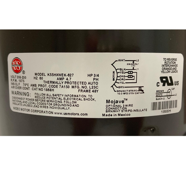 US Motors 1868H Mojave 3/4 Hp 1075 rpm, 6 polos, 1 eje, TEAO Cerramiento, 1 velocidad 5.6 diametro, CCW, Lead End, Reversible, 208-230 V, 60 hz, 1 ph, 10 mfd/370 VAC Capacitor K055WEK0627012B Sirve 3731 3735